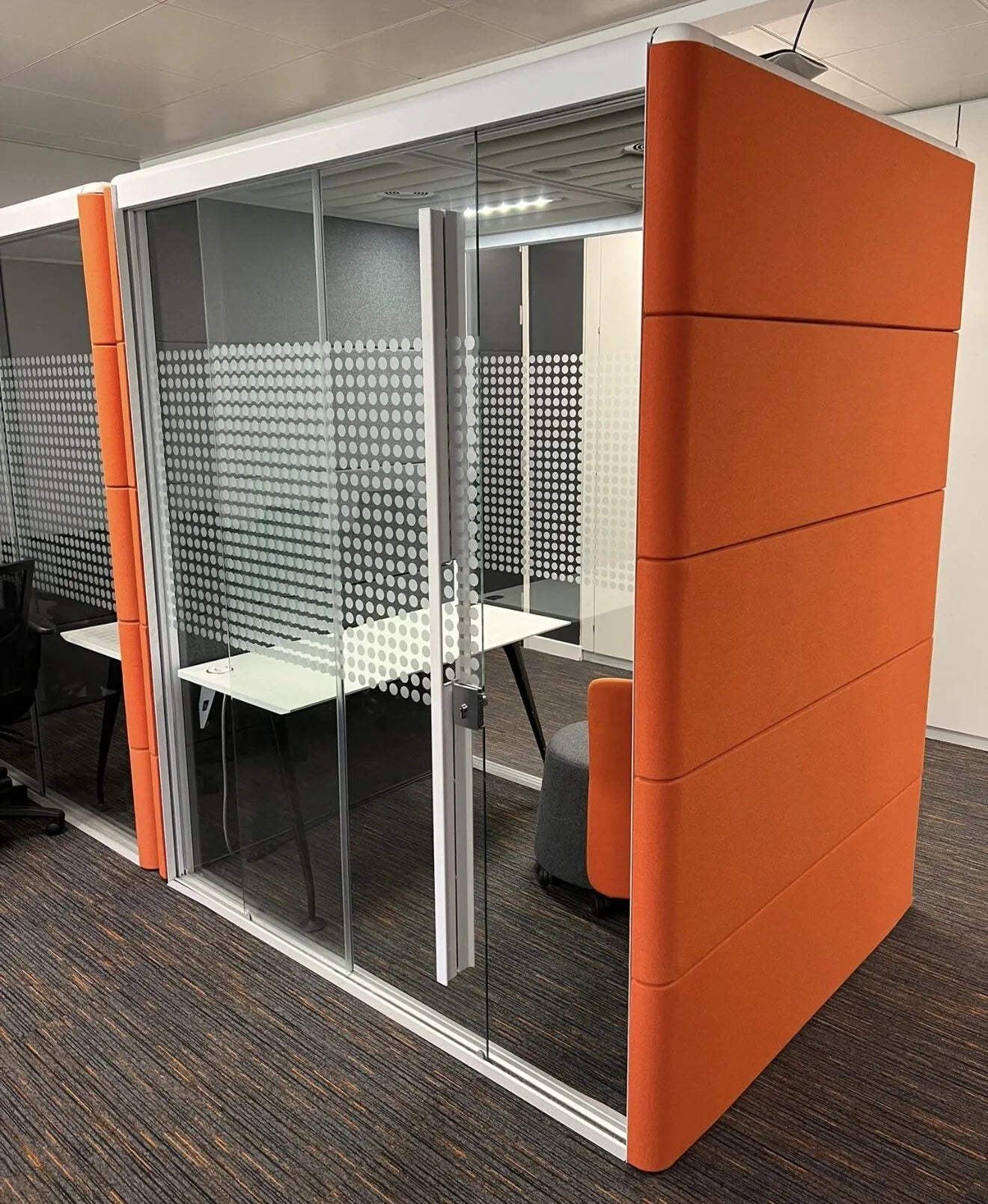 Available in multiple sizes, finishes, and configurations — from single-person pods to four-person meeting booths — fully customisable to your layout and brand.